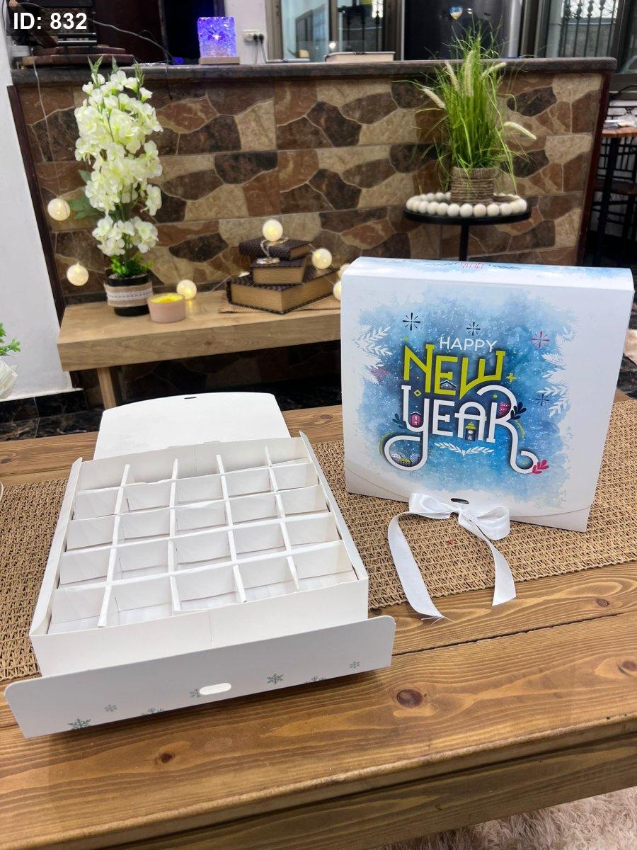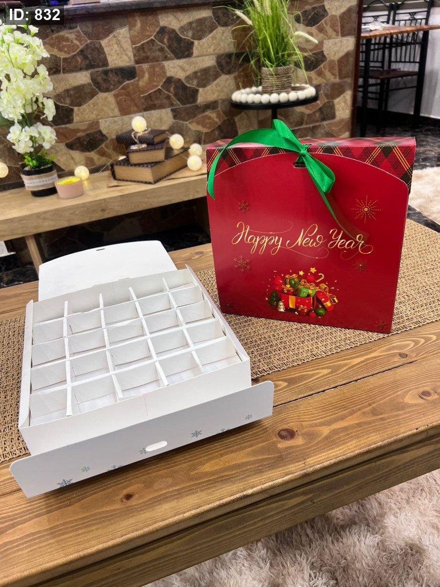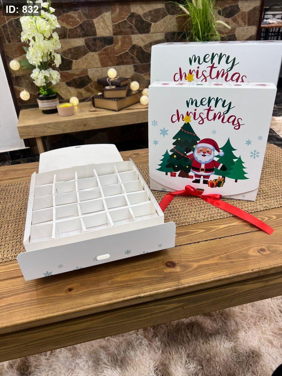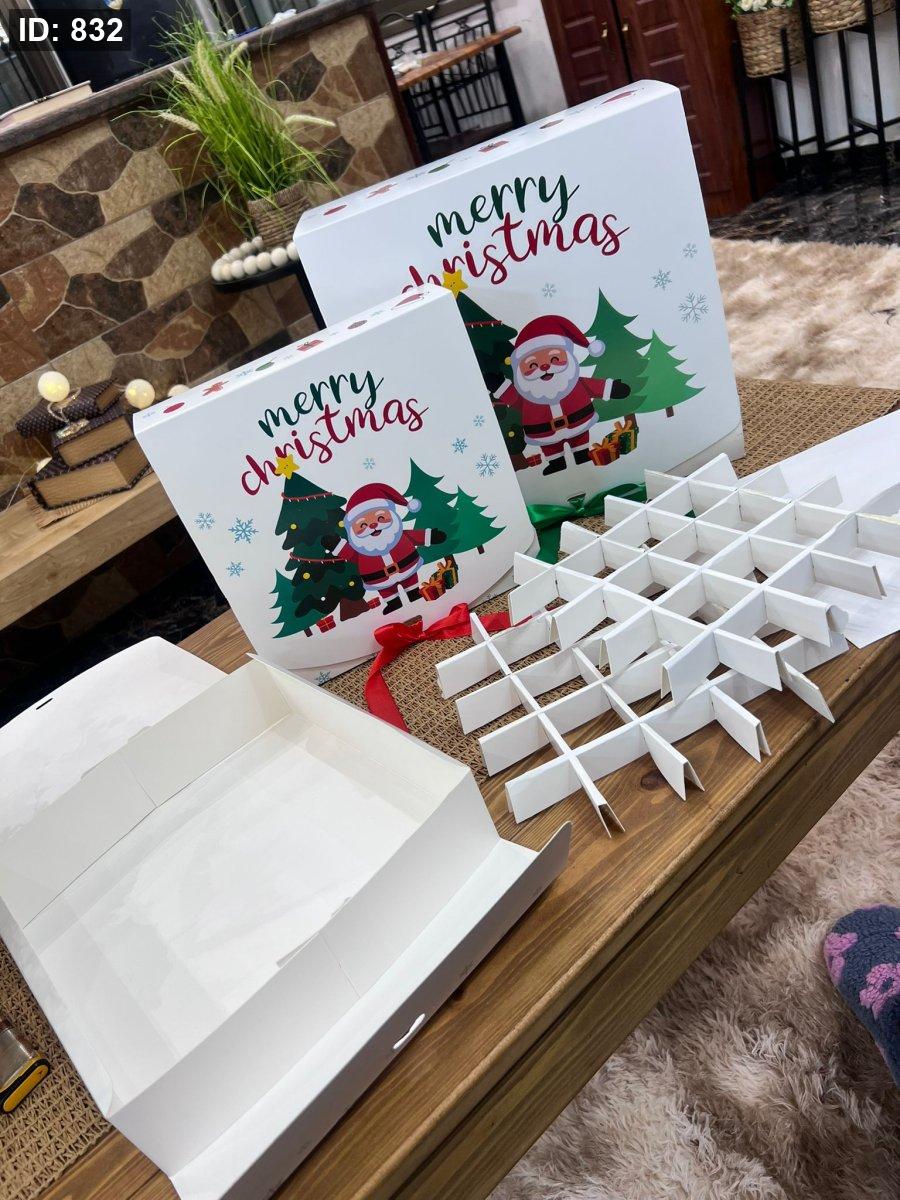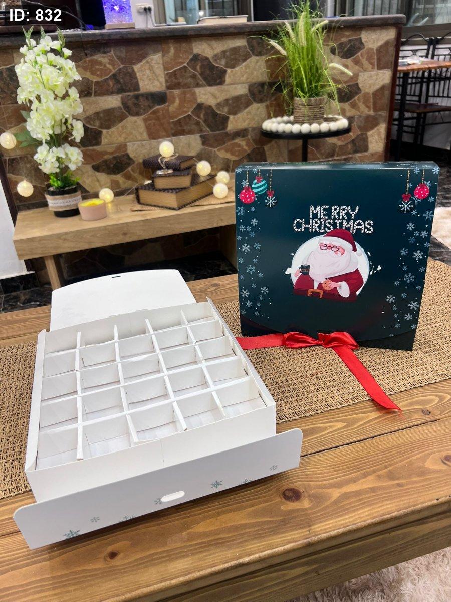 الصندوق مقاس ٢٤*٢٤*٦تتسع ل ٢٥ او ٥٠ قطعة شوكولاتة .. ويوجد ورق تغليف شوكولاتة خاص بالكريسماس