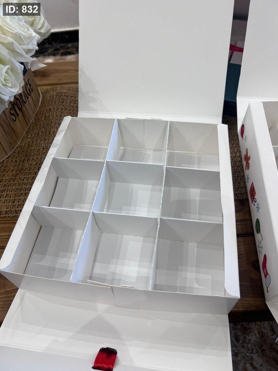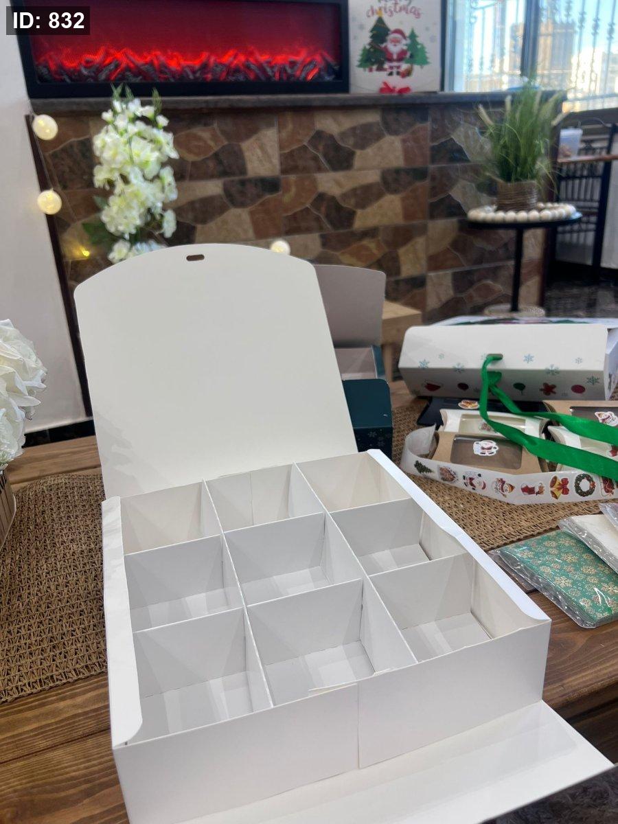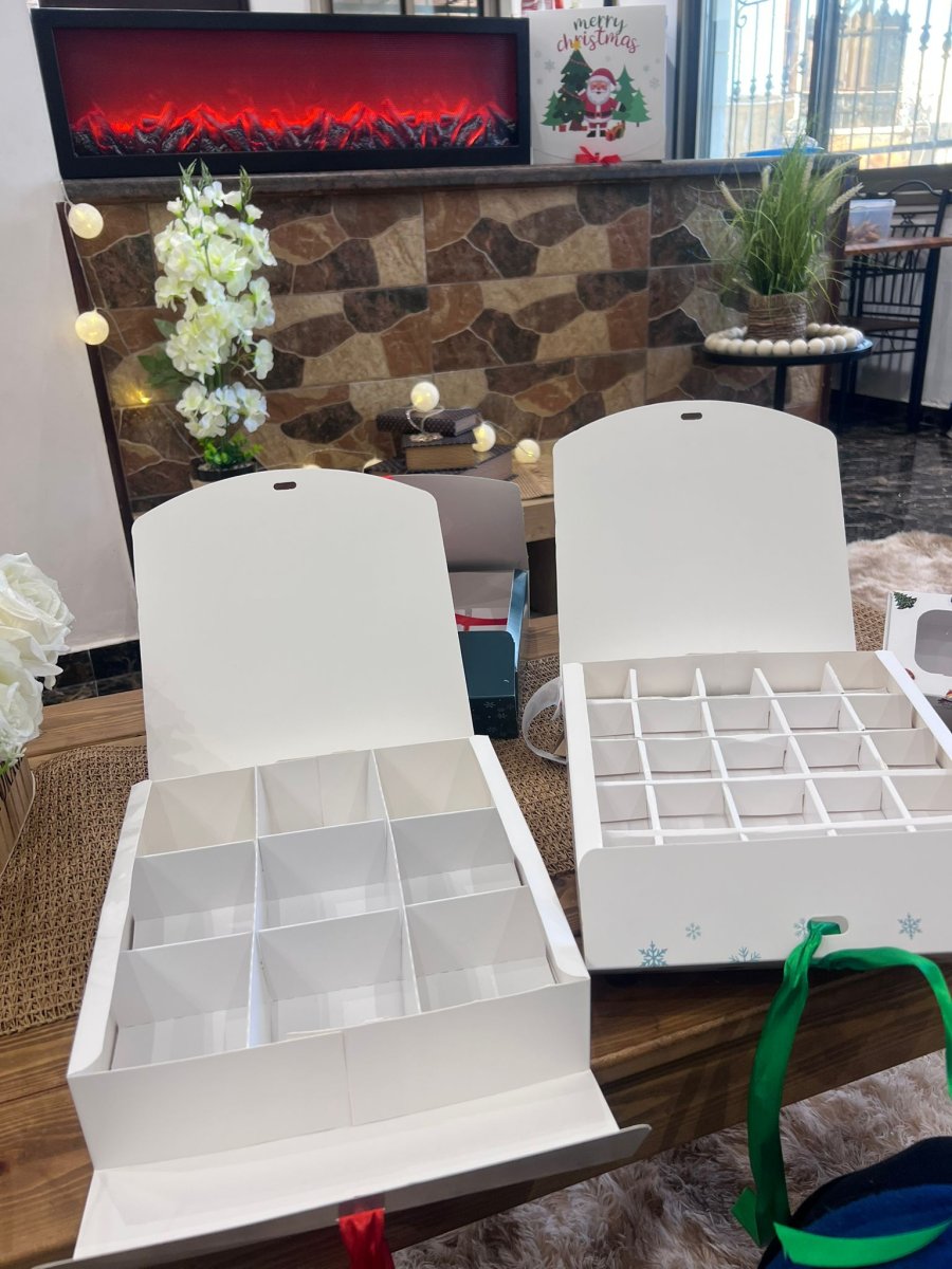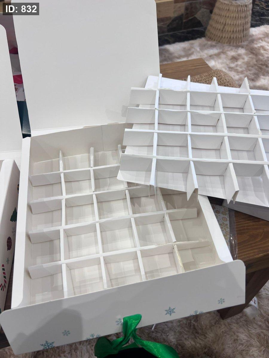 الصندوق مقاس ٢٤*٢٤*٦تتسع ل ٢٥ او ٥٠ قطعة شوكولاتة .. ويوجد ورق تغليف شوكولاتة خاص بالكريسماس ويوجد قواطع كبيرة ايضا للجوميز والمكسرات وغيرها