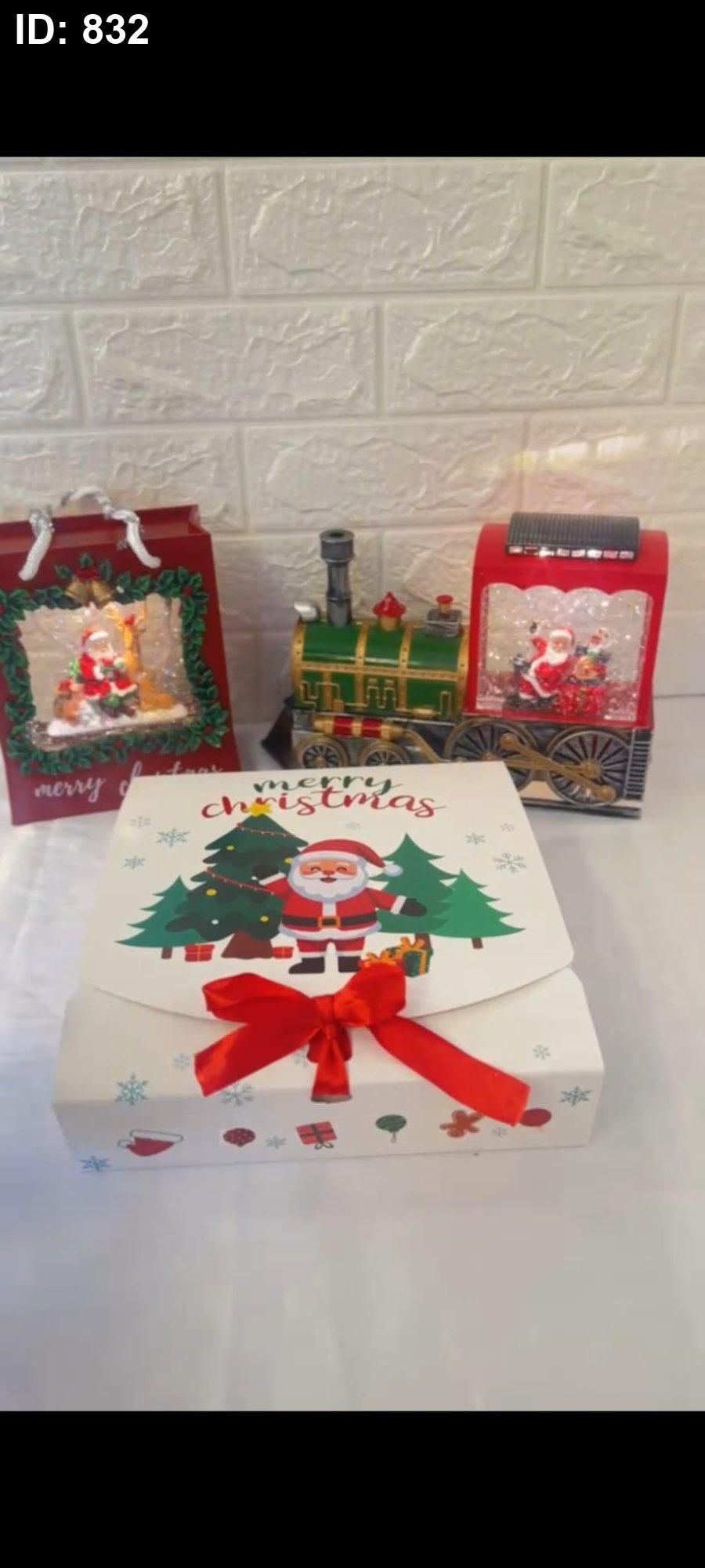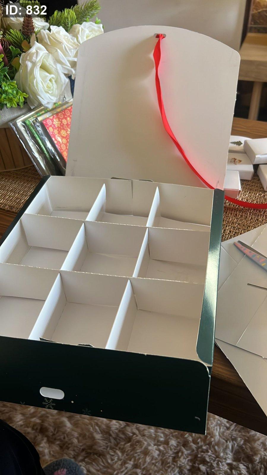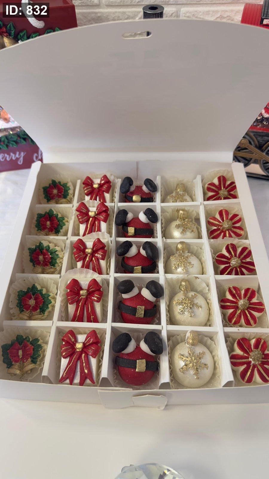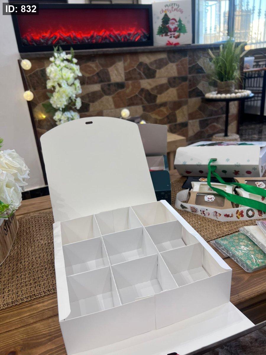 الصندوق مقاس ٢٤*٢٤*٦تتسع ل ٢٥ او ٥٠ قطعة شوكولاتة .. ويوجد ورق تغليف شوكولاتة خاص بالكريسماس ويوجد قواطع كبيرة ايضا للجوميز والمكسرات وغيرها